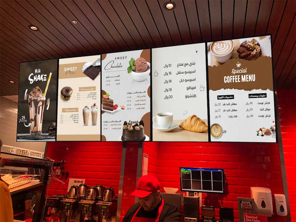 تساهم لافتات المطاعم ولافتات الكافيهات الرقمية في توفير تجربة ممتعة وتفاعلية للمستهلكين. يمكن للعملاء التفاعل مع الشاشات وتصفحها بحرية للاطلاع على المزيد من المحتوى الذي يقدمه عملك التجاري.